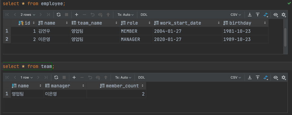 조회하기 전에 team 데이터를 두어개 더 넣어놓자.