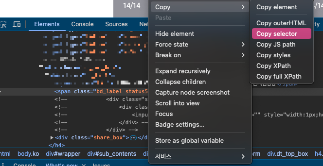 개발자 도구에서 요소 우클릭 > Copy > Copy selector