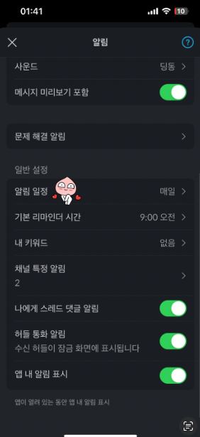 메시지는 작성이 되는데 계속 푸시 알람이 안와서 개발이 뭔가 잘못됐나 싶어 이리 뒤집어보고 저리 뒤집어 봤는데 결국 어플 설정에서 원인을 찾을 수 있었다.