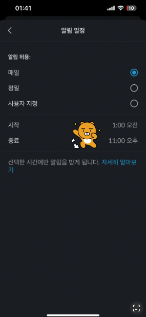 알림 종료 시간이 너무 이르게 설정되어있어서.. 핸드폰 푸시 알람이 안되었던 것이다.. . . 다들 앱 설정 확인 꼼꼼히 하시길..!