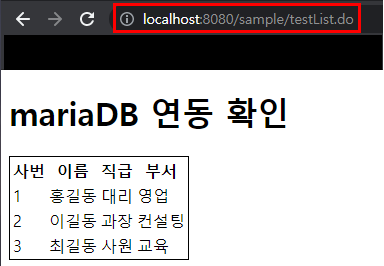 패키지, 파일 생성 MariaDB 테이블 생성, 데이터 추가 # 테이블 생성 CREATE TABLE `tbl_emp` ( `NO` INT(11) NOT NULL COMMENT '사번', `NAME` VARCHAR(50) NULL DEFAULT NULL COMMENT '이름', `JOB` VARCHAR(..