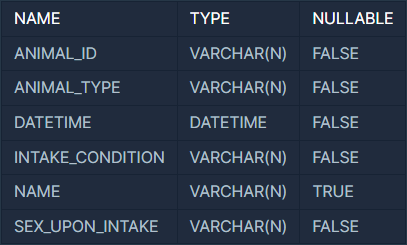 ANIMAL_INS 테이블은 동물 보호소에 들어온 동물의 정보를 담은 테이블입니다. ANIMAL_INS 테이블 구조는 다음과 같으며, ANIMAL_ID, ANIMAL_TYPE, DATETIME, INTAKE_CONDITION, NAME, SEX_UPON_INTAKE는 각각 동물의 아이디, 생물 종, 보호 시작일, 보호 시작 시 상태, 이름, 성별 및 중성화 여부를 나타냅니다.
