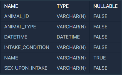 ANIMAL_INS 테이블은 동물 보호소에 들어온 동물의 정보를 담은 테이블입니다. ANIMAL_INS 테이블 구조는 다음과 같으며, ANIMAL_ID, ANIMAL_TYPE, DATETIME, INTAKE_CONDITION, NAME, SEX_UPON_INTAKE는 각각 동물의 아이디, 생물 종, 보호 시작일, 보호 시작 시 상태, 이름, 성별 및 중성화 여부를 나타냅니다.