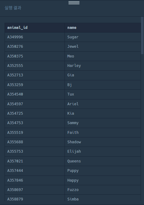 동물 보호소에 들어온 동물 중 젊은 동물1의 아이디와 이름을 조회하는 SQL 문을 작성해주세요. 이때 결과는 아이디 순으로 조회해주세요.