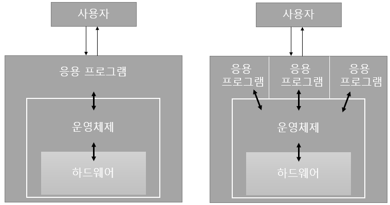 - 그리고 하나의 하드웨어를 여러 사용자가 공유해서 사용하는 경우에 응용 프로그램들끼리 효율적으로 서로 자원을 나눠 쓰기가 어려워 컴퓨터 시스템이 제대로 동작하지 못함