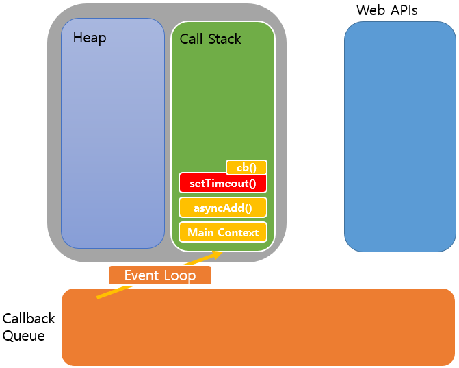 자 Call Stack에 적재되어 있는 asyncAdd()를 실행하려고 봤더니 안에 setTimeout()가 있고 또 cb라는 콜백함수가 있다. 그러면 자바스크립트 엔진에서는 Call Stack에 다음과 같이 이 두 개의 함수를 적재한다.