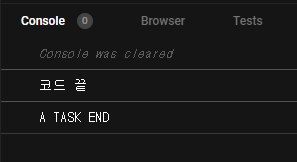 위에 작성된 코드는 뭐가 먼저 출력될까? 참고로 taskA는 딜레이 타임을 이용해서 taskA callback 함수 실행 시간을 늦췄다. 딜레이 타임은 millisecond 단위로 전달하니 2000이면 2초다. 즉 2초 뒤에 콜백함수를 실행하라는 의미가 된다. 아무튼 위의 코드가 실행되면 원래 우리가 여태 봐왔던 순서와는 다르게 출력되는 것을 볼 수 있다.