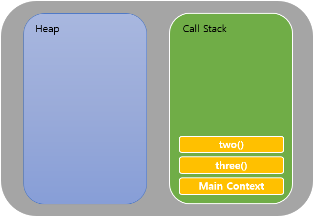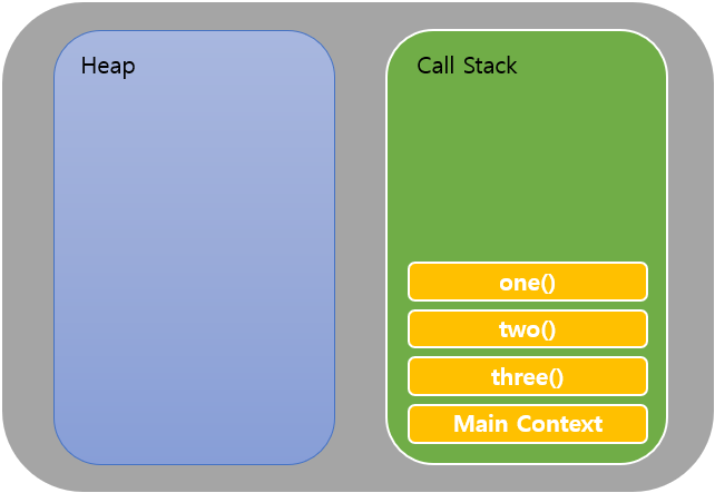 자바스크립트 엔진은 Heap과 Call Stack으로 이루어져 있다. Heap은 변수나 상수들이 메모리 할당이 이뤄지는 곳이며 동기와 비동기와는 크게 중요한 부분은 아니다.