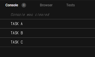세 개의 함수가 작성되어 있고, task A B C 순서대로 함수를 호출한다. 그럼 콘솔에는 당연히 호출한 순서대로 출력됐을 것이다.