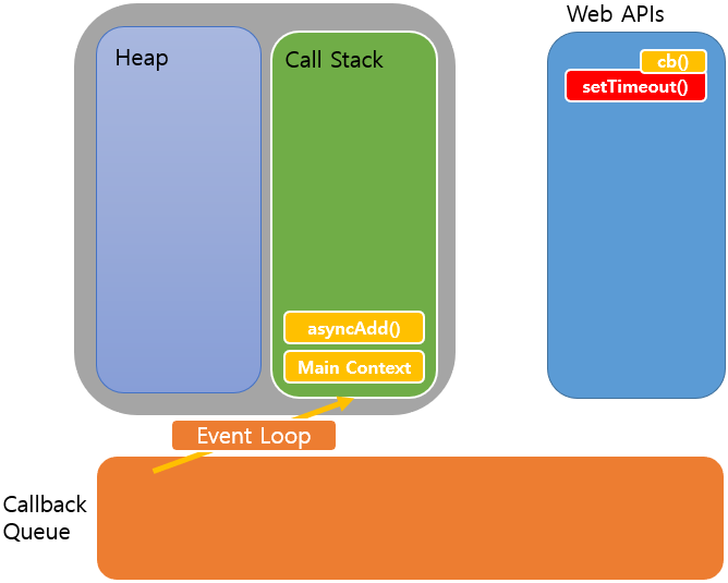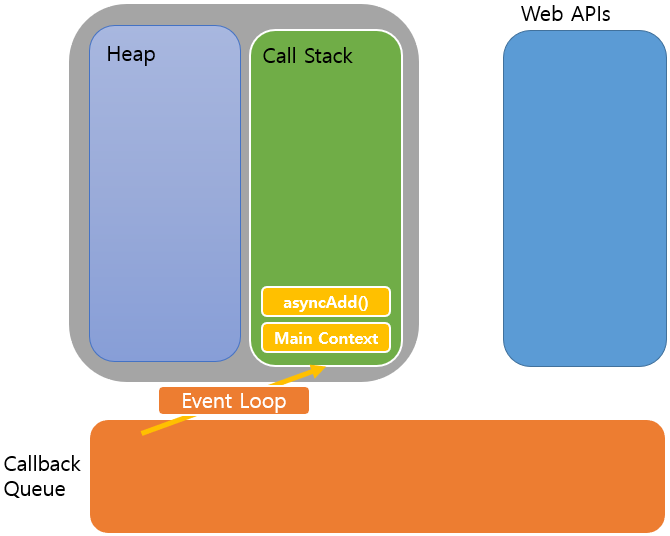 위 코드가 실행되면 초반 Call Stack에는 다음와 같이 Main Context와 asyncAdd()가 적재된다.