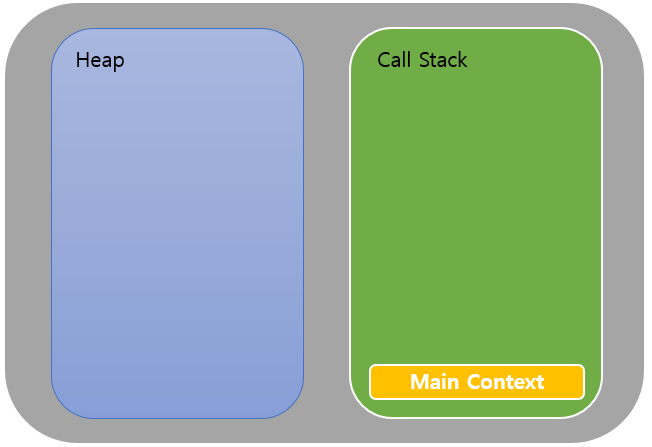 일단 자바스크립트를 실행하면 Main Context가 Call Stack에 가장 먼저 적재된다. Main Context는 자바스크립트 문맥의 최상위 문맥이다. Main Context가 Call Stack에 들어오는 순간이 프로그램 실행 순간이고 나가는 순간이 프로그램이 종료되는 순간이다. Java의 Main() 메서드와 비슷하다.