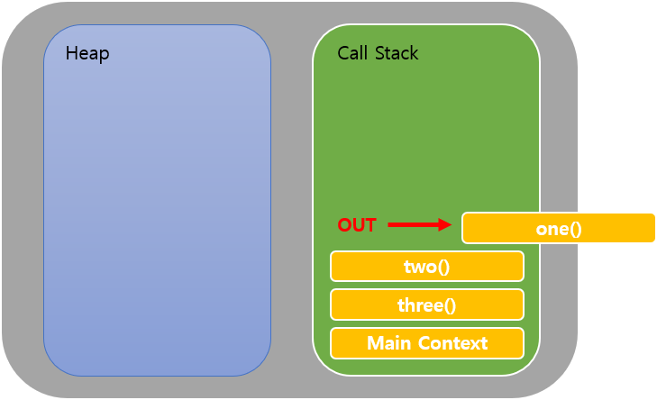 two()를 실행하려하는데 이번엔 one() 함수를 호출한다. 그럼 또 Call Stack에는 one() 함수가 적재된다.
