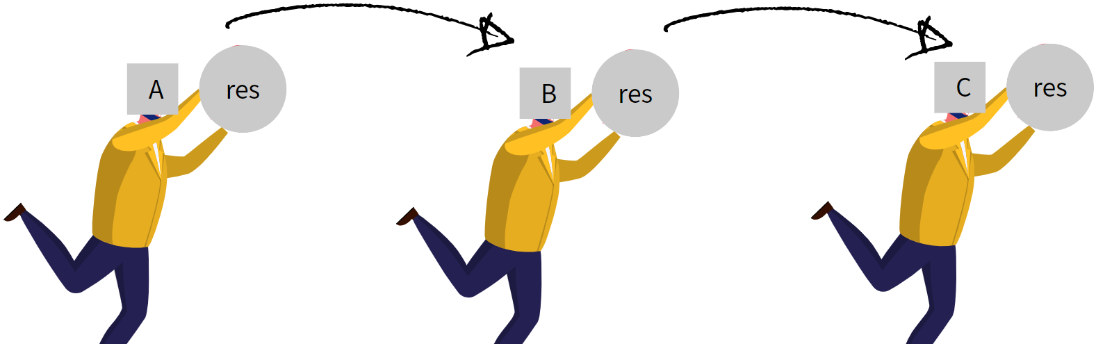 A에서 어떤 처리를 한 값을 B에게 넘겨주고 B에서 처리한 다음에 C에게 넘겨주는 형식.
