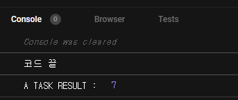 딜레이 타임으로 인해 taskA의 콜백 함수가 3초 늦게 실행되어 코드 끝이 먼저 실행된다. 이 코드에서 자세하게 볼 건 taskA의 함수를 호출할 때 a, b의 매개 값과 함수를 넘겨주었다. 그러면 taskA의 매개변수에는 순서대로 3, 4, 함수가 저장되어있다. 콜백 함수를 보면 a와 b를 더하고 난 후 cb에 더한 값을 넘겨준다. 그래서 taskA의 호출 부분의 함수가 a와 b를 더한 값을 넘겨 받을 수 있게 되어 7이라는 값을 출력한다.