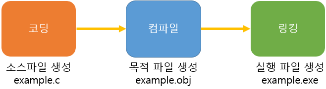 - C 언어로 작성된 프로그램은 크게 코딩(coding), 컴파일(compile), 링킹(linking)의 3단계 변환 과정을 거쳐 완성된다.