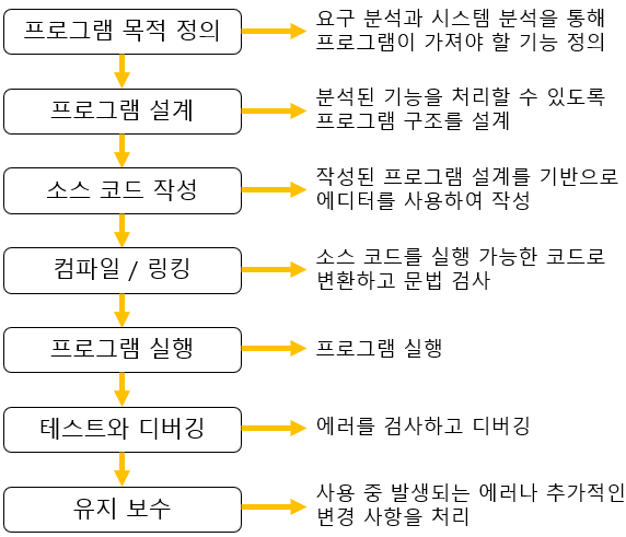 - 위와 같은 개발 단계별로 작업을 수행하는 데는 반드시 요구되는 프로그램은 에디터와 컴파일러이다.