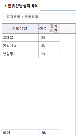 기말 시험은 어렵다는 평이 많았다. JAVA와 함께 양대산맥이었음. 하지만 그래도 운영체제는 내용 자체가 생소하고 어렵다보니까 이해하는데 JAVA는 진짜 무슨 일? 아무튼 탈기출 중 하나였던게 운영체제였다. 나는 JAVA와 운영체제를 같은 날에 시험을 봐서 JAVA는 좀 그래도 배웠던 언어이니 후순위로 밀어두고 운영체제를 정말 열심히 공부했다(뭔가 과목 자체가 흥미롭기도 했었다.). 그래서 그런지 탈기출이란 생각은 뭔가 안 들었던 거 같고 고득점을 노린다면 워크샵만으로는 부족하고 교재를 같이 꼭 봐서 이해해야한다. 나는 두 개를 틀렸다.