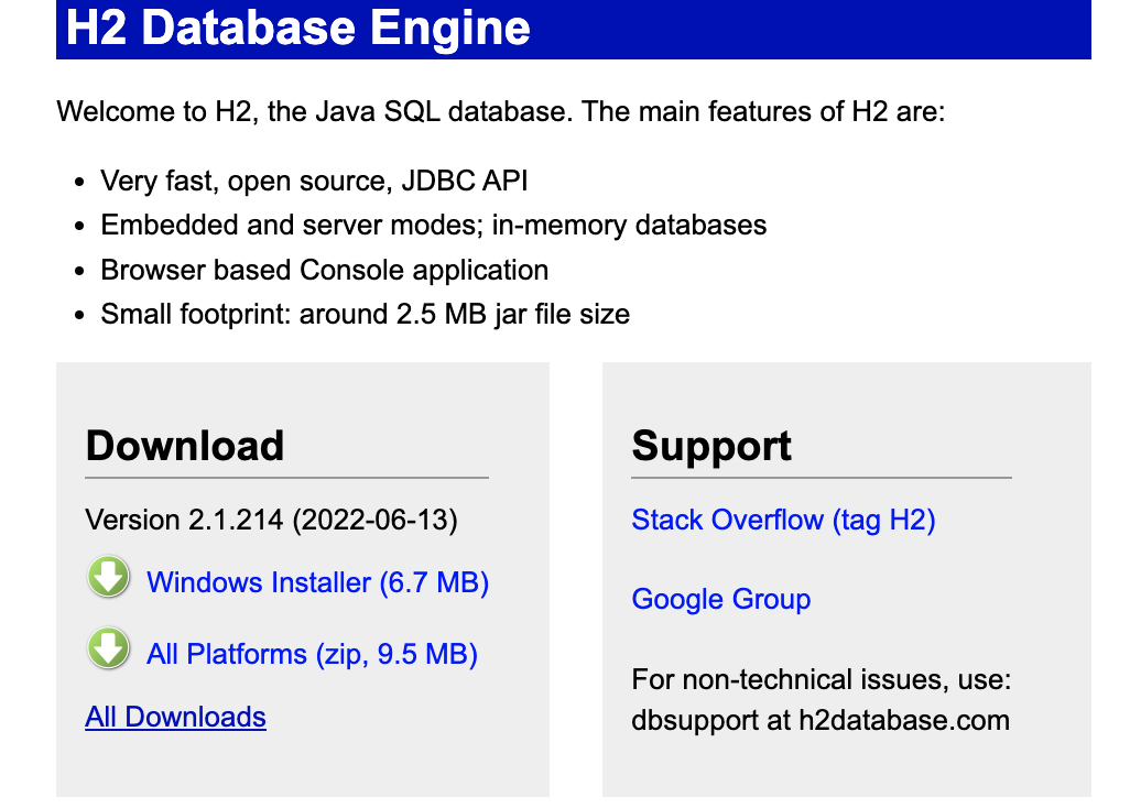 - 참고로 springboot 버전이 올라갈 때마다 h2 데이터베이스 라이브러리의 버전이 궁금하다면 spring.io에 접속 > Projects > Spring Boot > Learn 탭 > 버전 옆 Reference Doc. > Dependency Version > 컨트롤+F로 h2 검색하면 찾을 수 있다.
