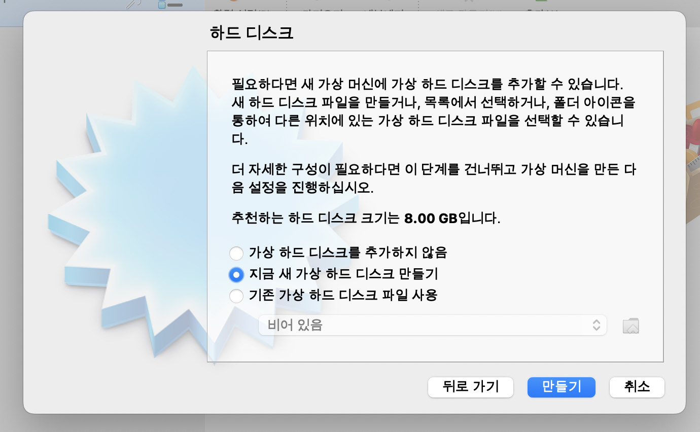 마지막으로 하드디스크 크기를 정해주고 만들기를 누르면된다. 나는 어차피 강의를 들을 때만 사용할 거 같아서 적게 할당했다. 10GB를 하고싶었는데 3이 안지워져서 10.30GB로 해버림