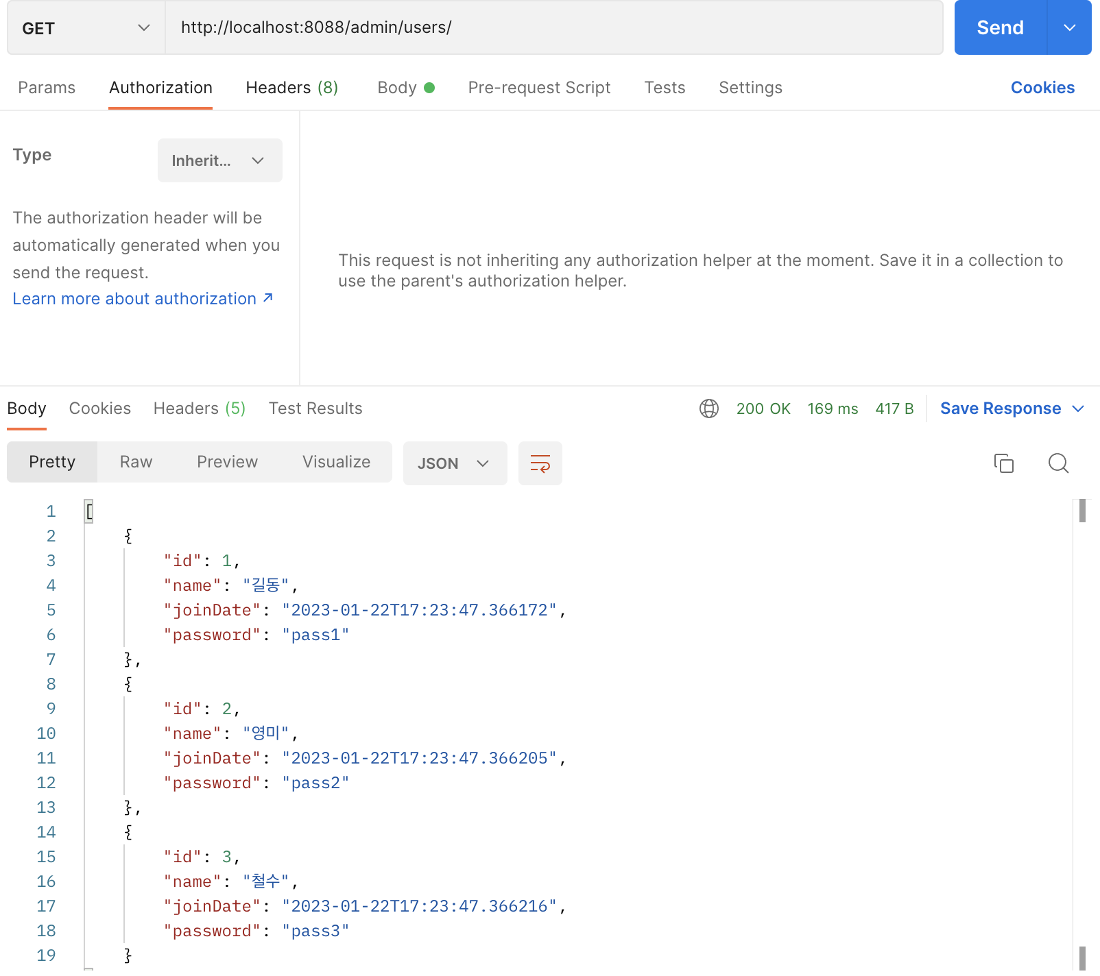 전체 사용자 조회 시 비밀번호와 주민등록번호가 모두 보이게 된다.