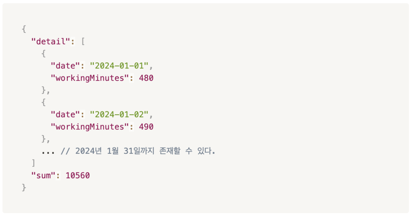출근하기의 경우 요청 값으로 workDate를 굳이 받지 않아도 되지만 테스트를 위해 추가하기로했다. workDate가 없으면 현재 날짜로 DB에 저장하고 workDate가 있으면 workDate로 저장한다. 추후 개발 완료 시 workDate를 받지 않도록 수정할 예정